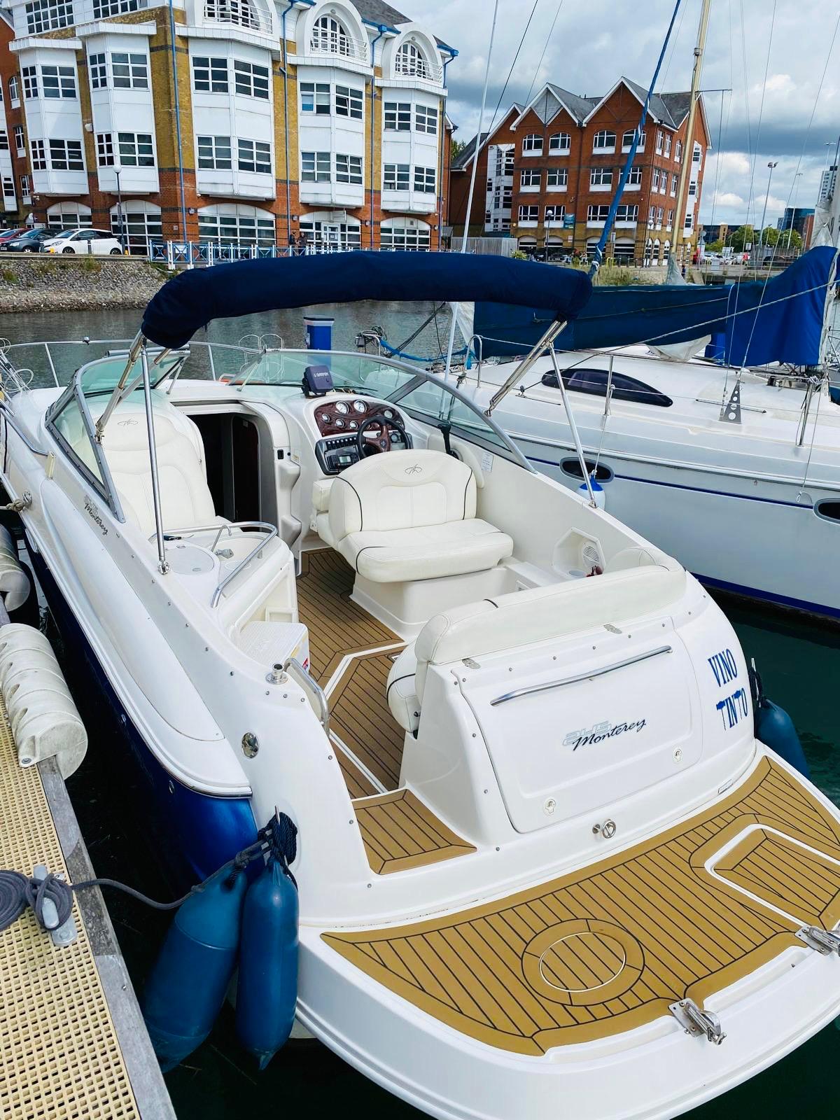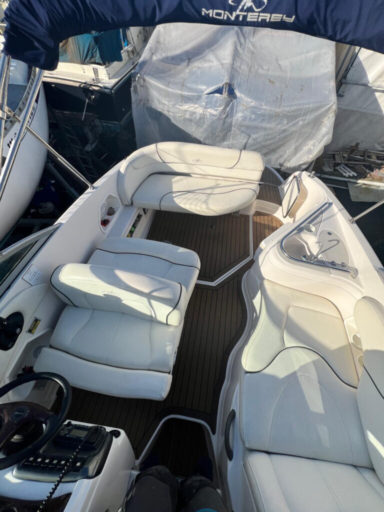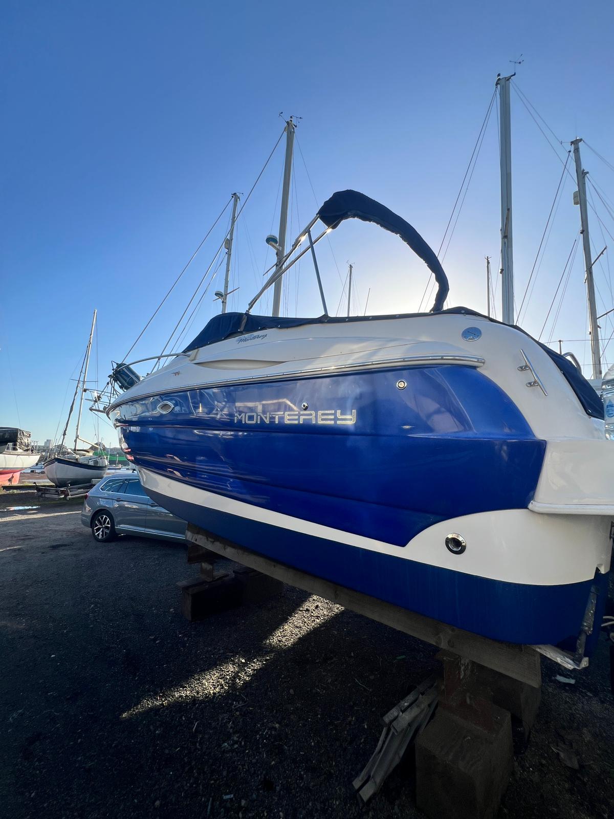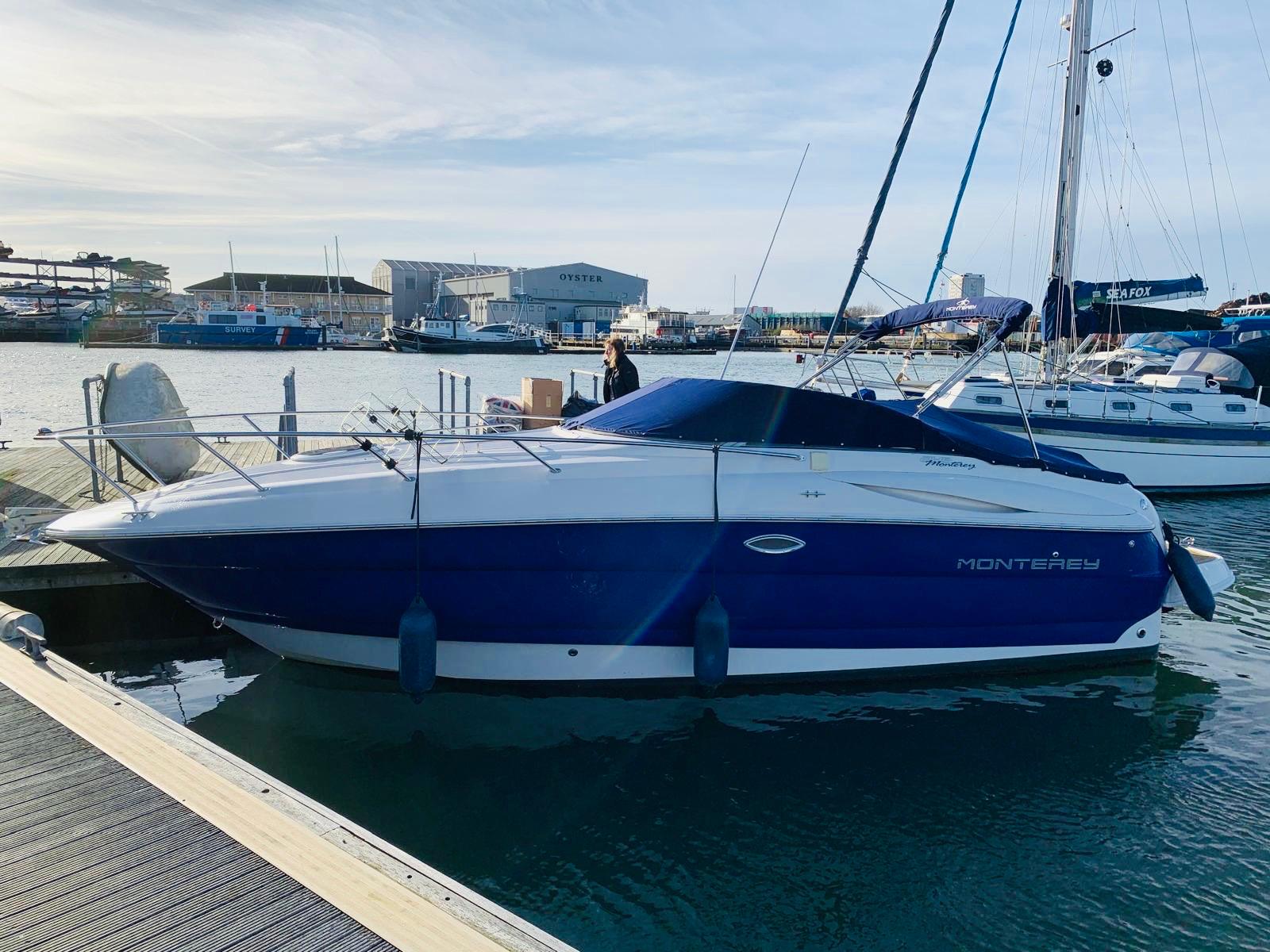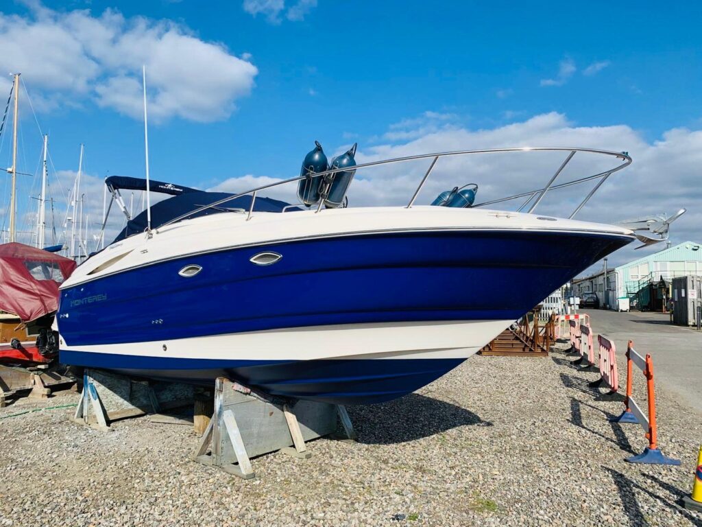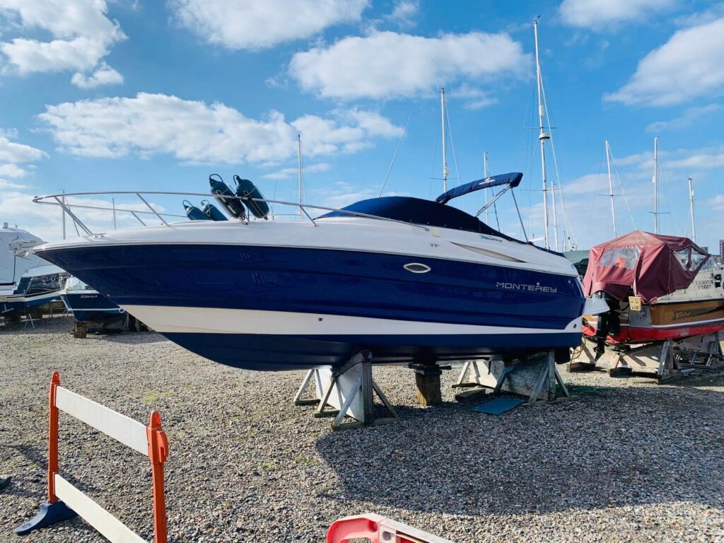 Well-maintained and much loved by the current owner, showing evidence of this through previous ownership with excellent full-service records and documents. The Monterey 245 CR is a sports cruiser with plenty of power, offering a good water sports platform. Alternatively, it can be a good cruiser for relaxing and entertaining on weekends. A well-laid-out cockpit with sink, ice well and coolbox offers a wonderful social feel under the Bimini or the full canopy cover for the cooler evenings. The cockpit extends to a large bathing – swim platform with a shower perfect for those days on the water. Sleeps four, a double under cockpit cabin and a double berth that converts in the saloon. Galley with hot/cold water sink, fridge, hot plate, and microwave. Heads with a shower hot/cold water basin, and a toilet.