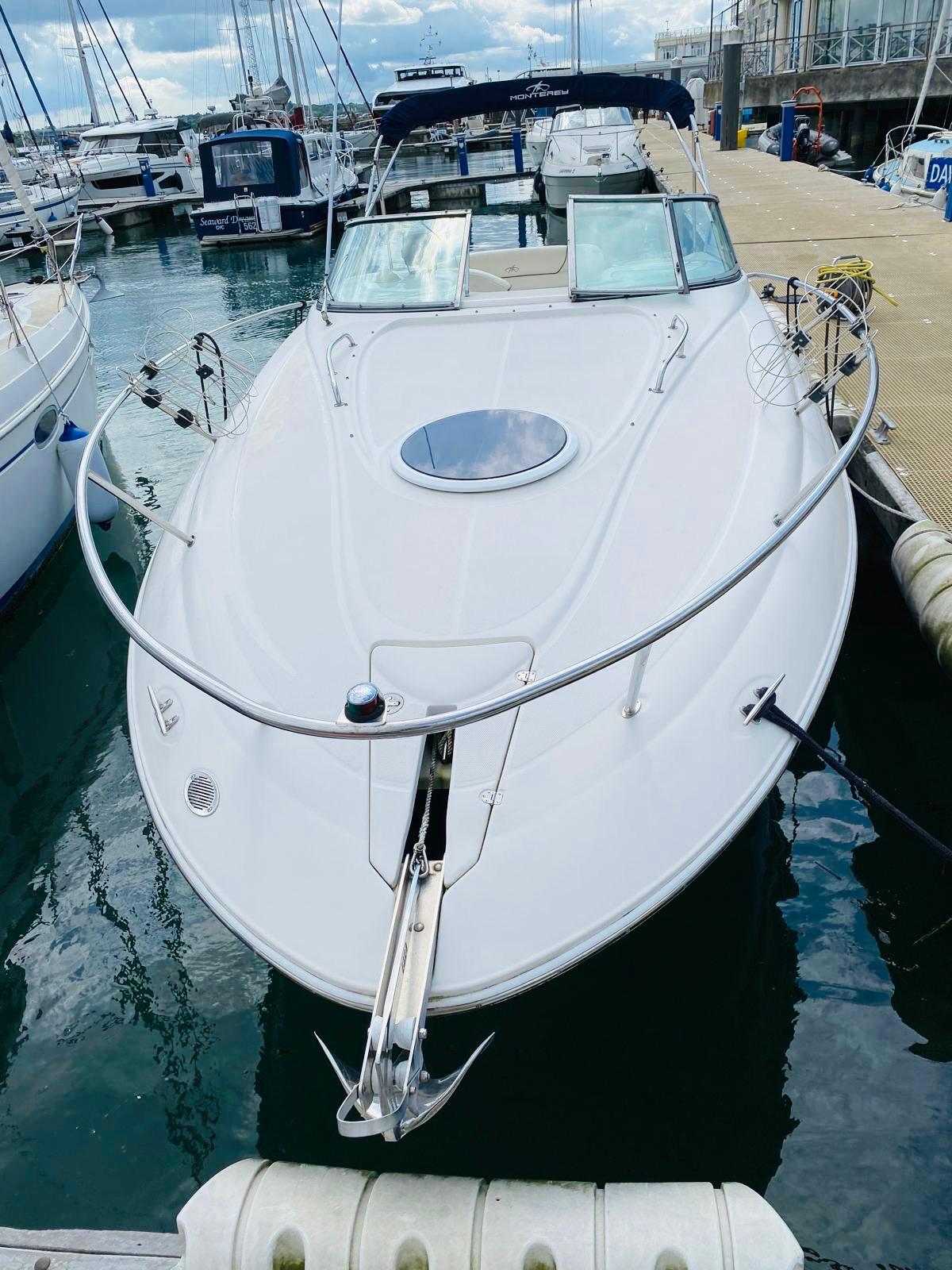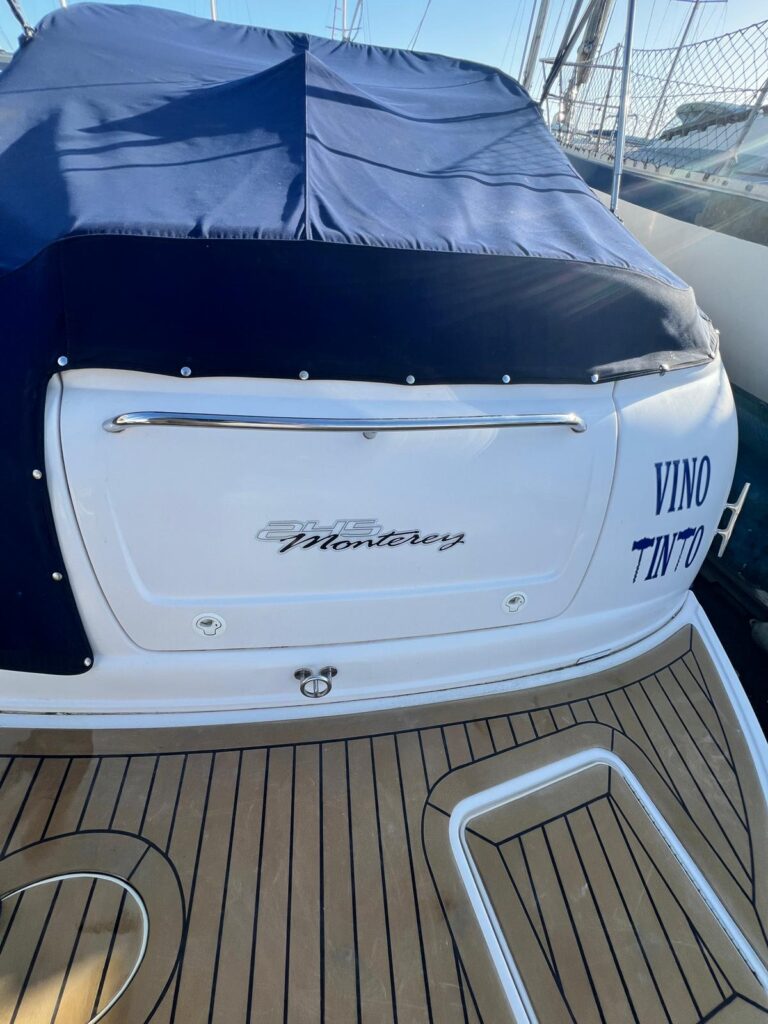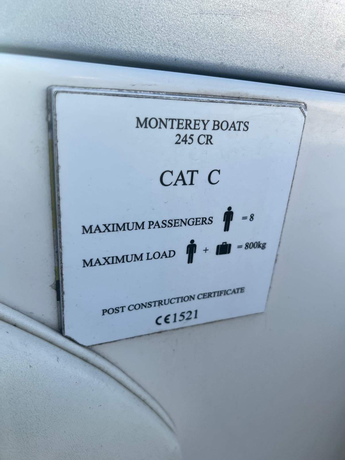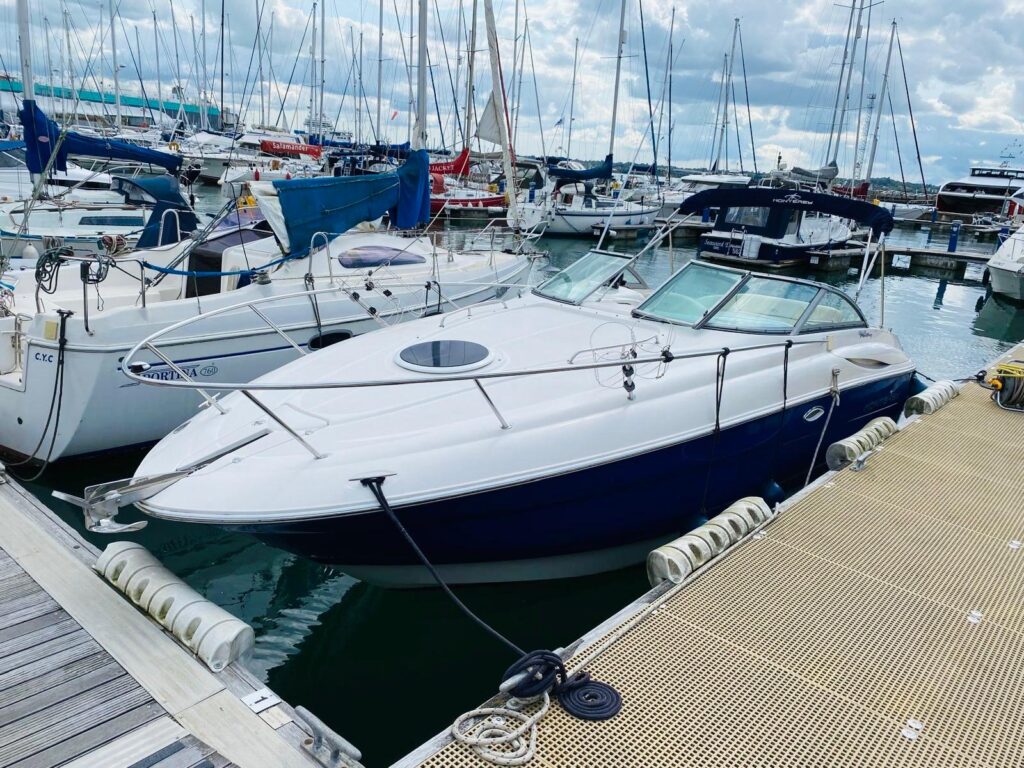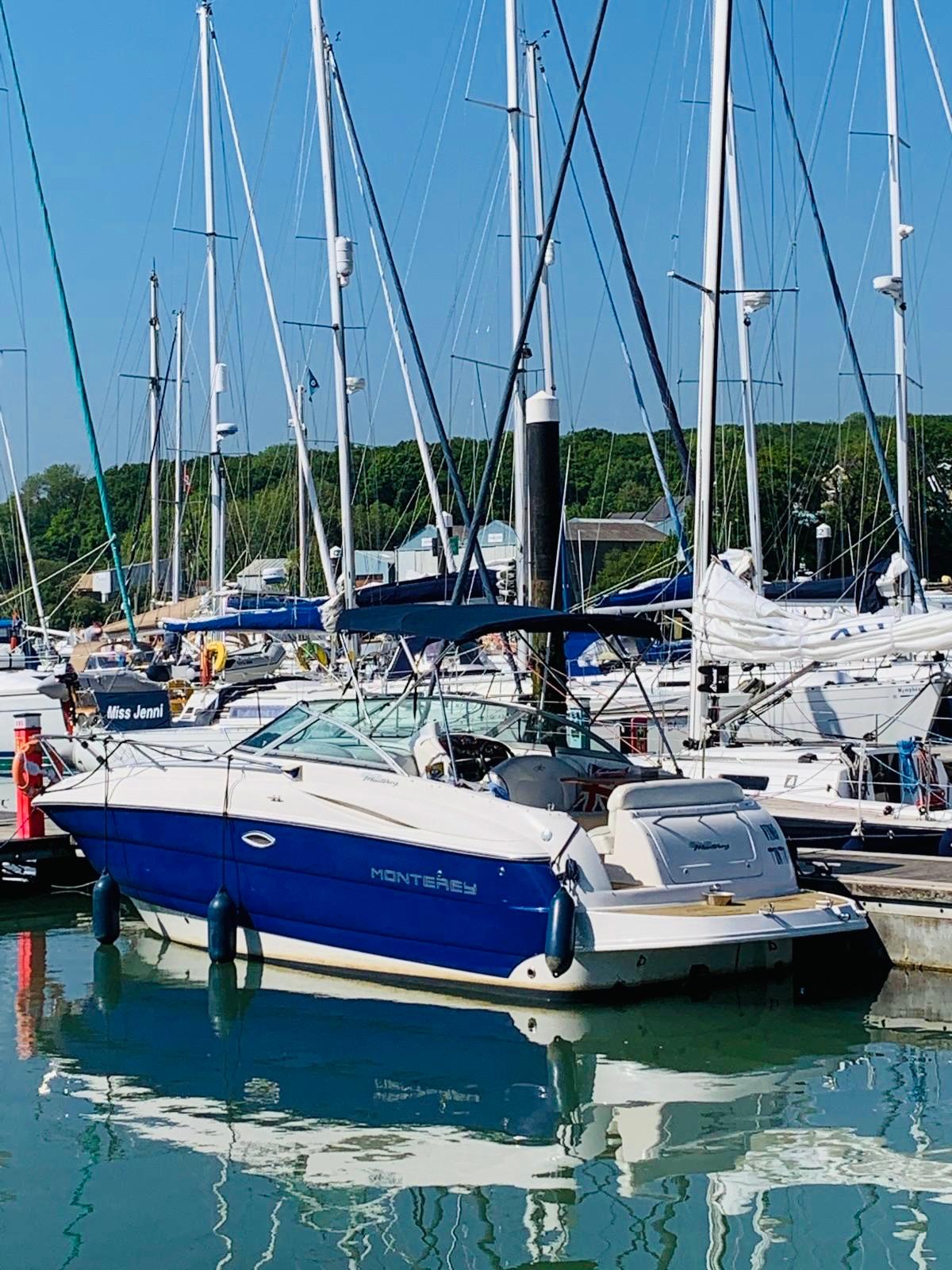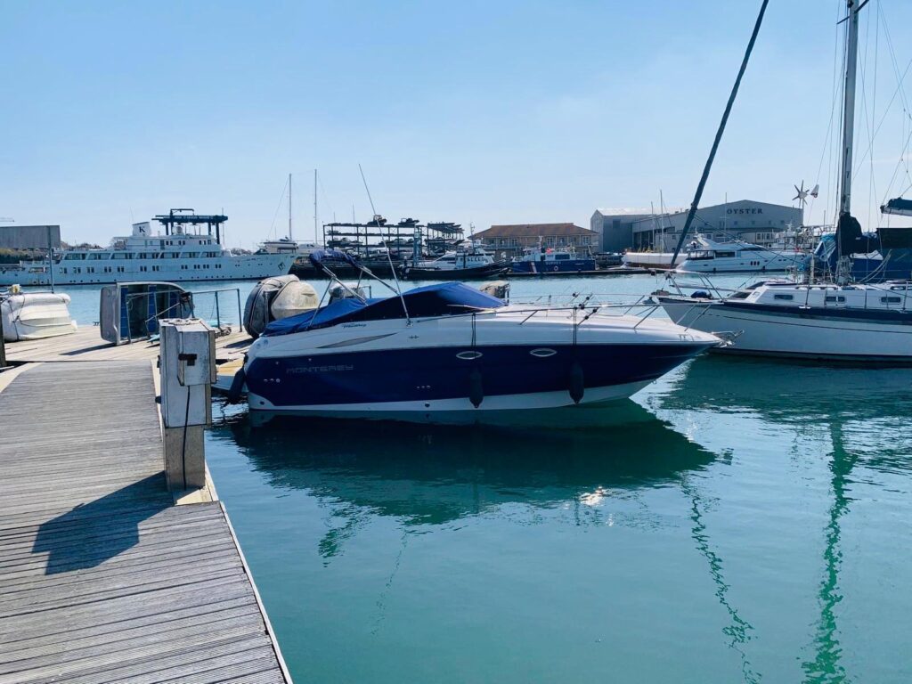 Well-maintained and much loved by the current owner, showing evidence of this through previous ownership with excellent full-service records and documents. The Monterey 245 CR is a sports cruiser with plenty of power, offering a good water sports platform. Alternatively, it can be a good cruiser for relaxing and entertaining on weekends. A well-laid-out cockpit with sink, ice well and coolbox offers a wonderful social feel under the Bimini or the full canopy cover for the cooler evenings. The cockpit extends to a large bathing – swim platform with a shower perfect for those days on the water. Sleeps four, a double under cockpit cabin and a double berth that converts in the saloon. Galley with hot/cold water sink, fridge, hot plate, and microwave. Heads with a shower hot/cold water basin, and a toilet.